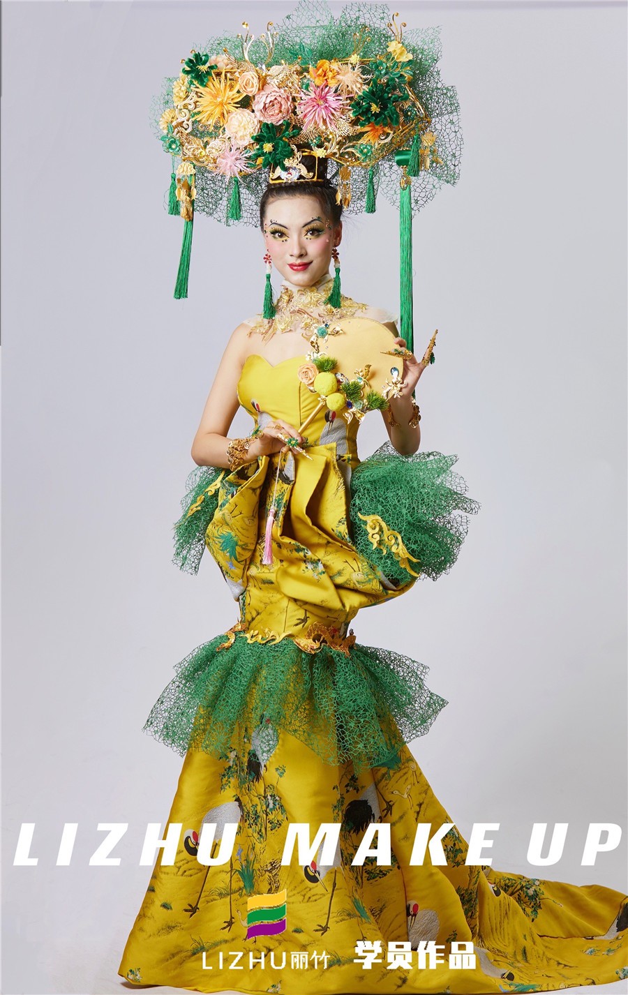 廣西彩妝培訓學校創(chuàng)意作品:整體造型以黃色為主色調,綠為配色,在用現(xiàn)代元素做點綴,配合華麗的頭飾,將極具中國特色的古典美體現(xiàn)得淋淋盡致。揚眉轉袖若飛鴻,寶釵搖動墜金鈿,營造了很強的視覺沖擊。