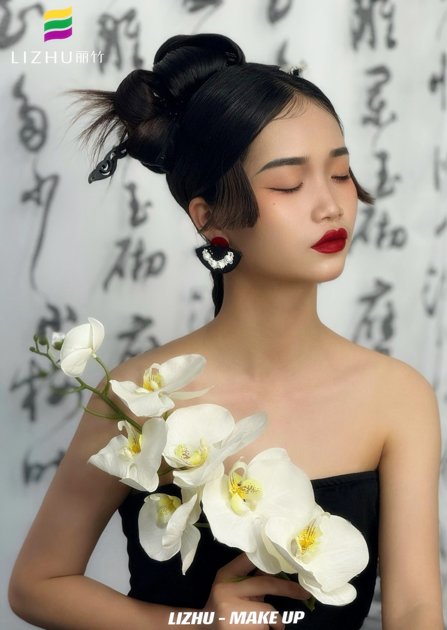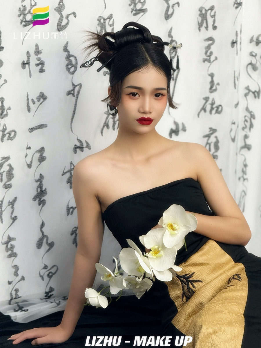 南寧新娘化妝師培訓(xùn)、南寧寫真化妝學(xué)習(xí)作品---新中式造型:一套改良版露肩中式套裝,搭配簡(jiǎn)約利落中式盤頭,將東方的優(yōu)雅和現(xiàn)代女性風(fēng)格融合,整個(gè)造型流露出一種文人筆墨下的詩意。如果你想近期在南寧學(xué)新娘化妝,那么千萬不要錯(cuò)過南寧人物寫真化妝學(xué)校-麗竹學(xué)校年末感恩答謝會(huì)的學(xué)費(fèi)特惠福利啦!