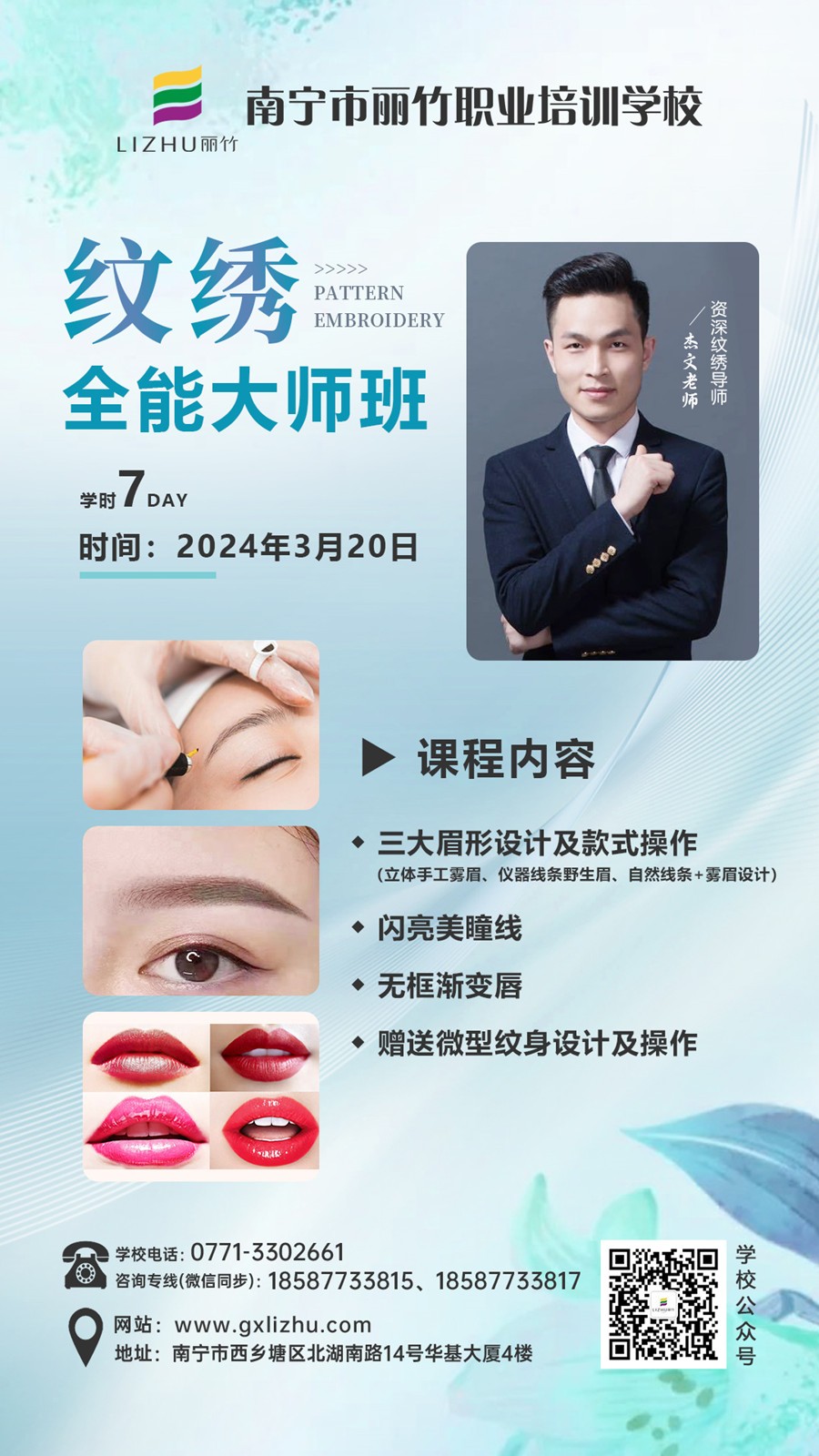南寧紋繡培訓(xùn)、南寧紋繡學(xué)校排名:想在南寧學(xué)紋繡,想知道南寧紋繡學(xué)校哪家好?南寧紋繡學(xué)校排行榜推薦你,可以到南寧紋繡培訓(xùn)學(xué)校(麗竹紋繡培訓(xùn)學(xué)校),去了解即將在3月20日開班的紋繡全能大師班的詳細課程內(nèi)容以及報名優(yōu)惠活動。
